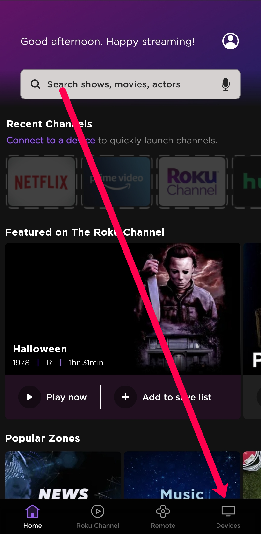 - Install the Roku App on your Android device and sign into your Roku account. Then, tap on Devices.
