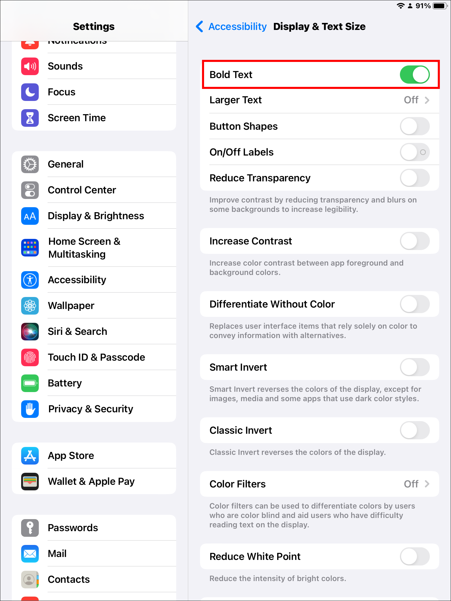 - Activate the “Differentiate without Color” switch to alter interface items that rely mainly on color. This can be a great help for those who are colorblind.