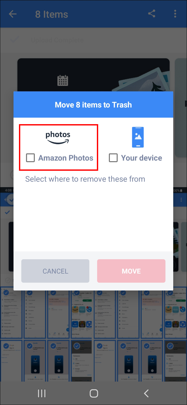 Android users who want all of their Amazon Photos storage gone can do this via the Amazon Photos Android app. Amazon hasn’t yet included a feature for selecting them all quickly. Instead, you can select multiple pictures and move them to the trash.