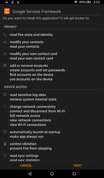 Next up is the big part. On a standard Android tablet, installing apps outside of the Play Store would be as easy as installing the standard APK. Unfortunately, it’s not quite that easy on an Amazon Fire tablet. Since Google Play isn’t installed on your device, all apps sold through the Play Store won’t run without Google Play Services installed along with it since certain apps like Gmail and Google Maps check for authentication through that app.