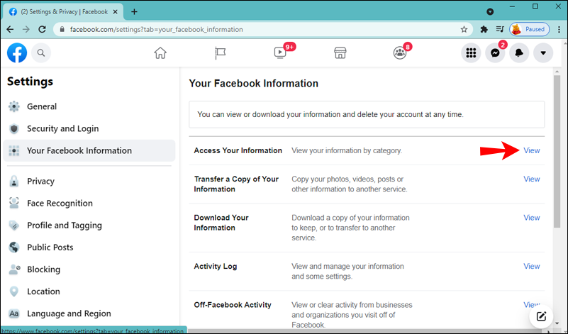 - Click Settings and Privacy, then click Your Facebook Information located in the left sidebar.