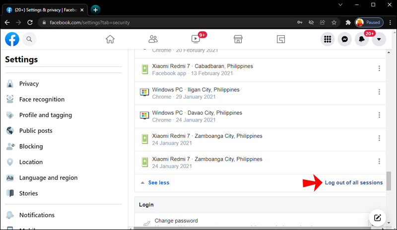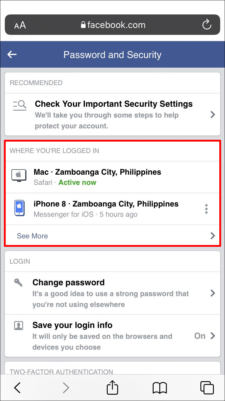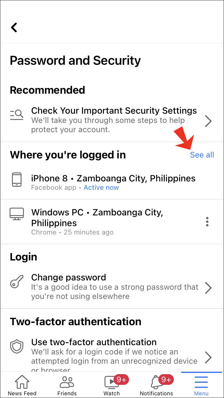 - Check out the “Where you are logged in” list to see the last two devices used to access your Facebook account. You can expand the list by tapping on the “See All” icon in the top right corner.
