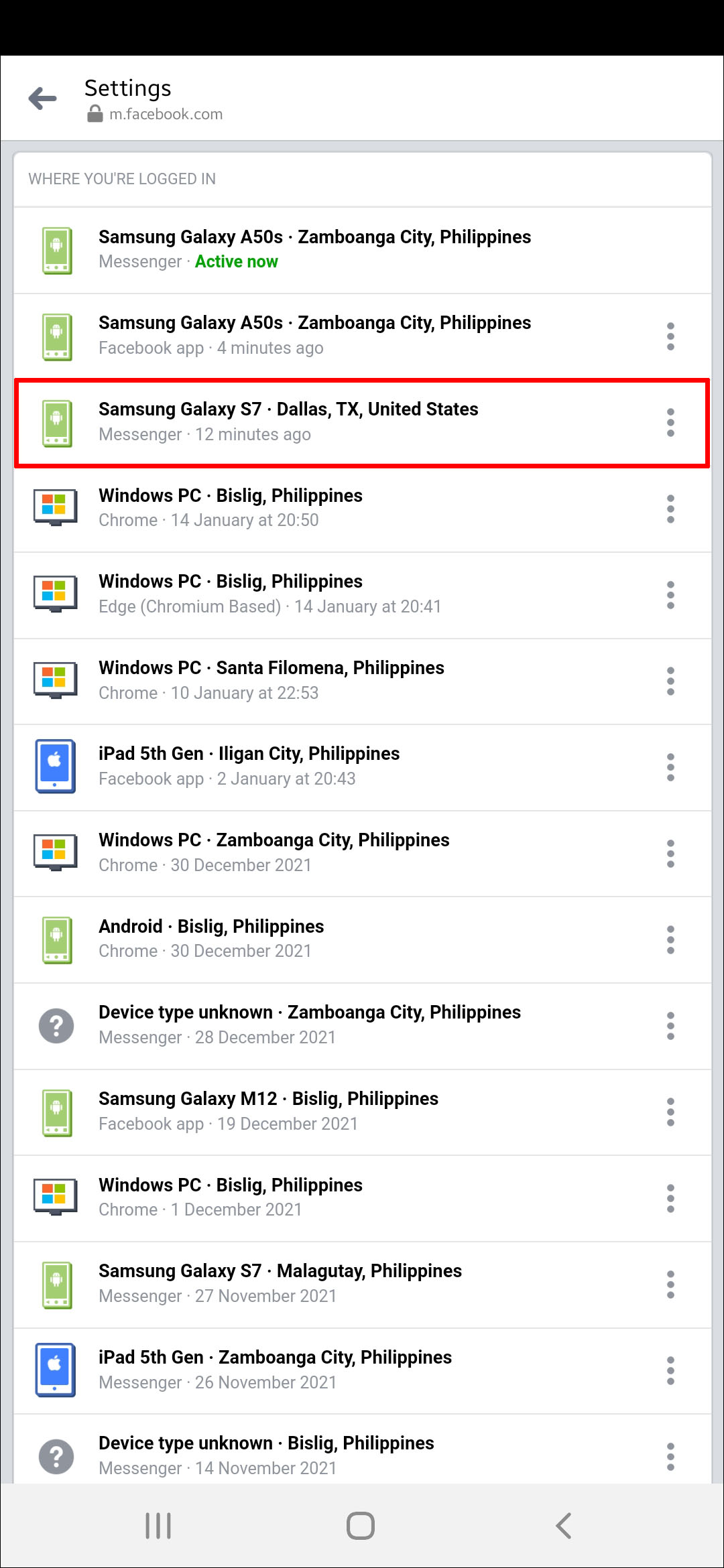 This information will allow you to see if all the devices listed and their locations are familiar. If they aren’t, then it’s likely that a third party has accessed your Facebook account.