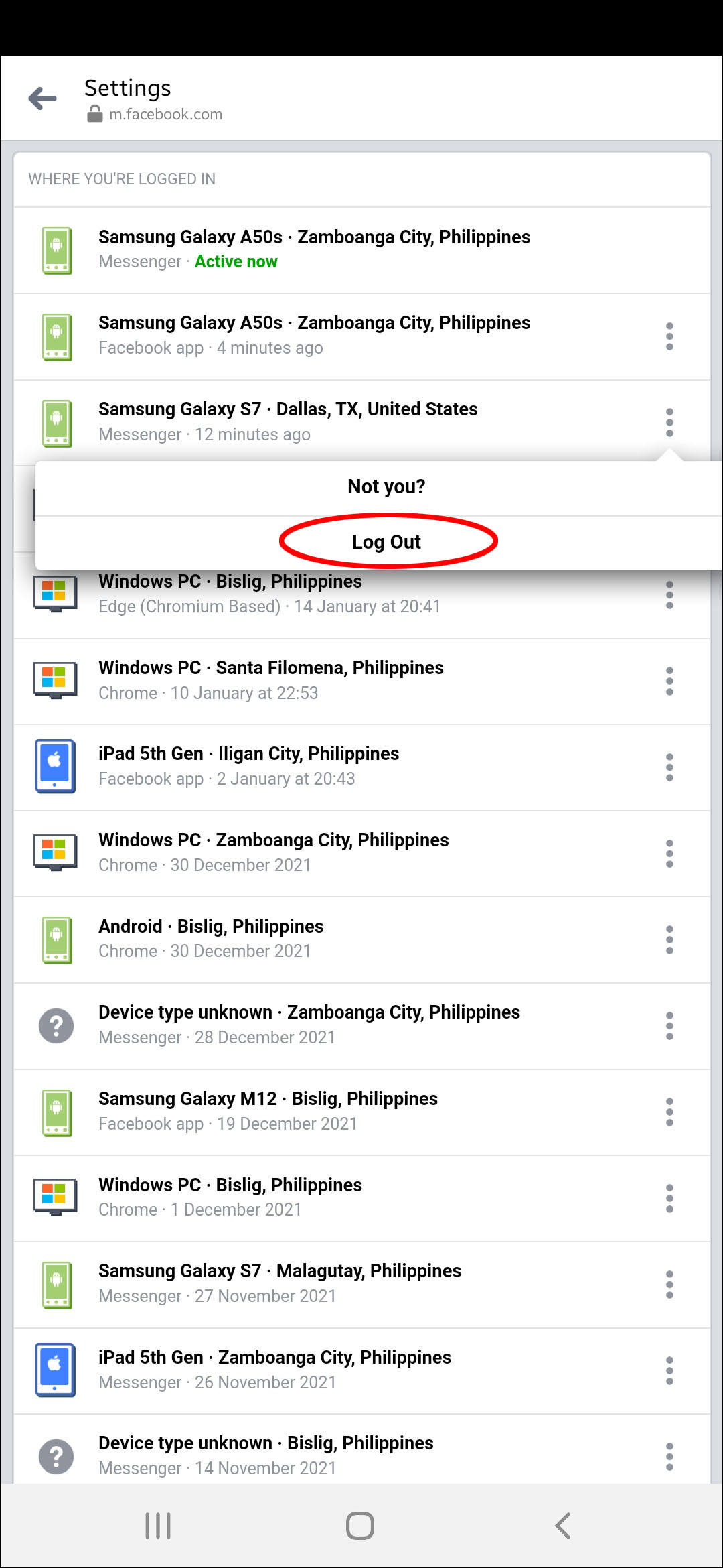 - A list of all the devices that Messenger is logged into will appear. Select the session that you want to log out of.