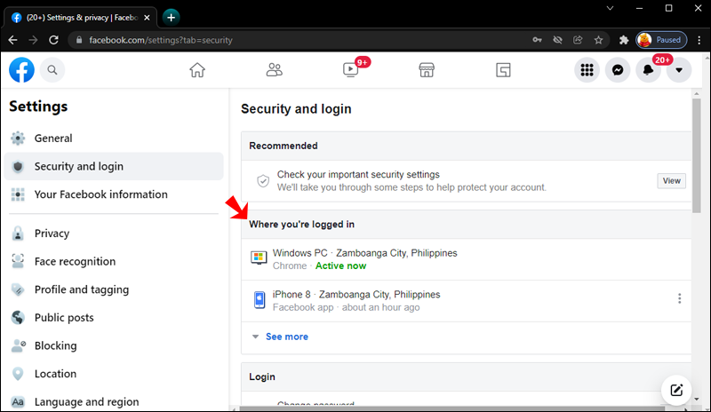 - A tab labeled “Where You’re Logged In” will be visible listing your logged-in devices. Select “See More” if you don’t see your device.