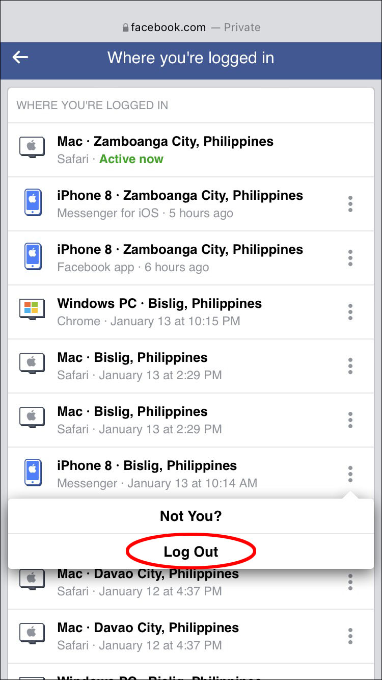 - Confirm the action by tapping“Log Out.” You will be signed out of all the devices listed except the one you are currently using to access your account.