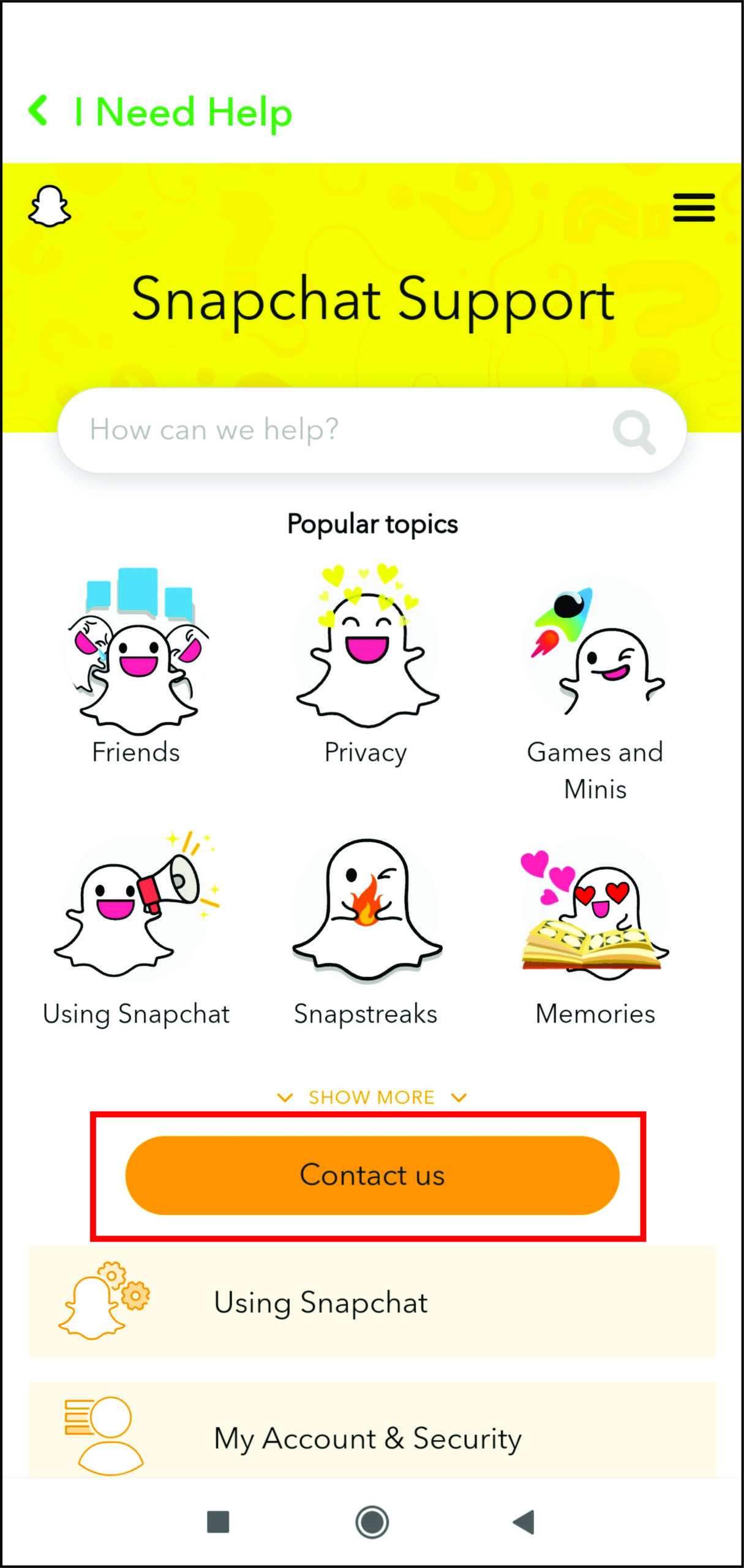 - Scroll down to Support and you’ll see I Need Help.