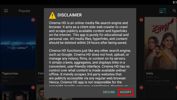 - Open the Cinema HD app, the icon for which can be found on the lower tab on the homepage of your FireStick TV.