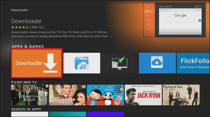 - Type “Downloader” into the search bar and then choose the option to download and install the app.