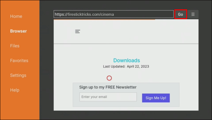 - Enter the URL: firesticktricks.com/cinema, then select “Go.”