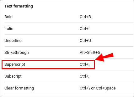 - Choose “Superscript” from the list of options. On the right-hand side, you’ll see the ‘’CTRL +.’’ shortcut.