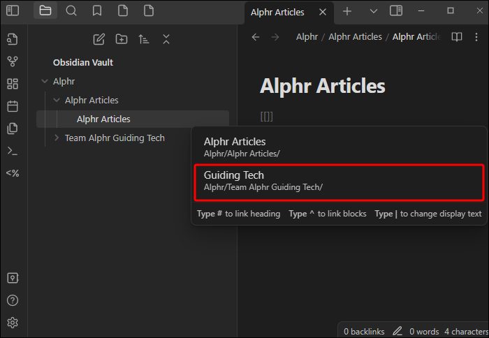 And there you have it, a link that takes you to another folder. On the right side of the screen, you’ll see “Backlinks for [link name]” and be able to go to all the places where the link is mentioned. That includes the folder or note where you just came from.