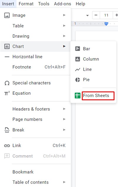 - You can also head back to your Google Doc by clicking on Insert > Chart. The bottom of the menu has a From Sheets option. Tap that and your most recent Graph will appear (just be sure to give it a name in Google Sheets so it’s easily identifiable).