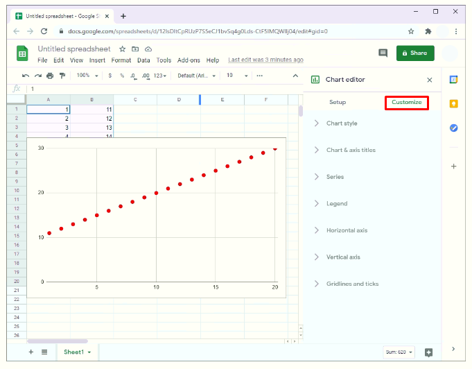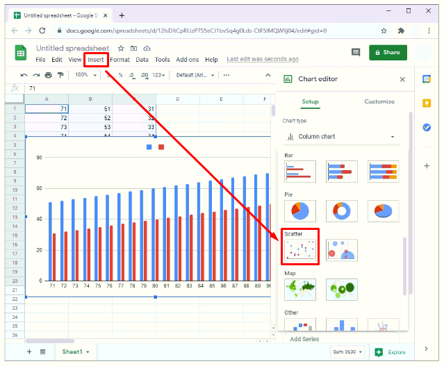 • If Google Sheets doesn’t open a scatter plot by default, proceed to step 5.