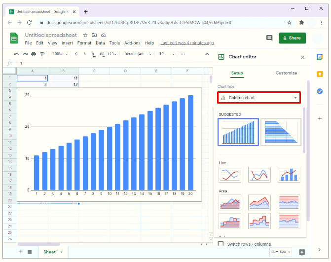 - Under “Chart type”, click on the dropdown menu to select column chart type.