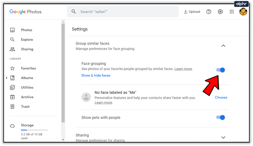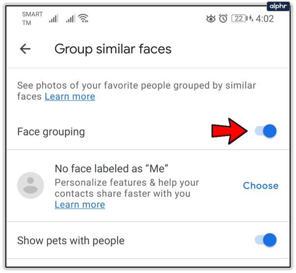 Face Grouping is activated by default, although it isn’t available in every country. However, if groups of faces aren’t showing up when you search, the setting may have been turned off. You’ll need to activate it to be able to search for people by name. Here’s how it’s done: