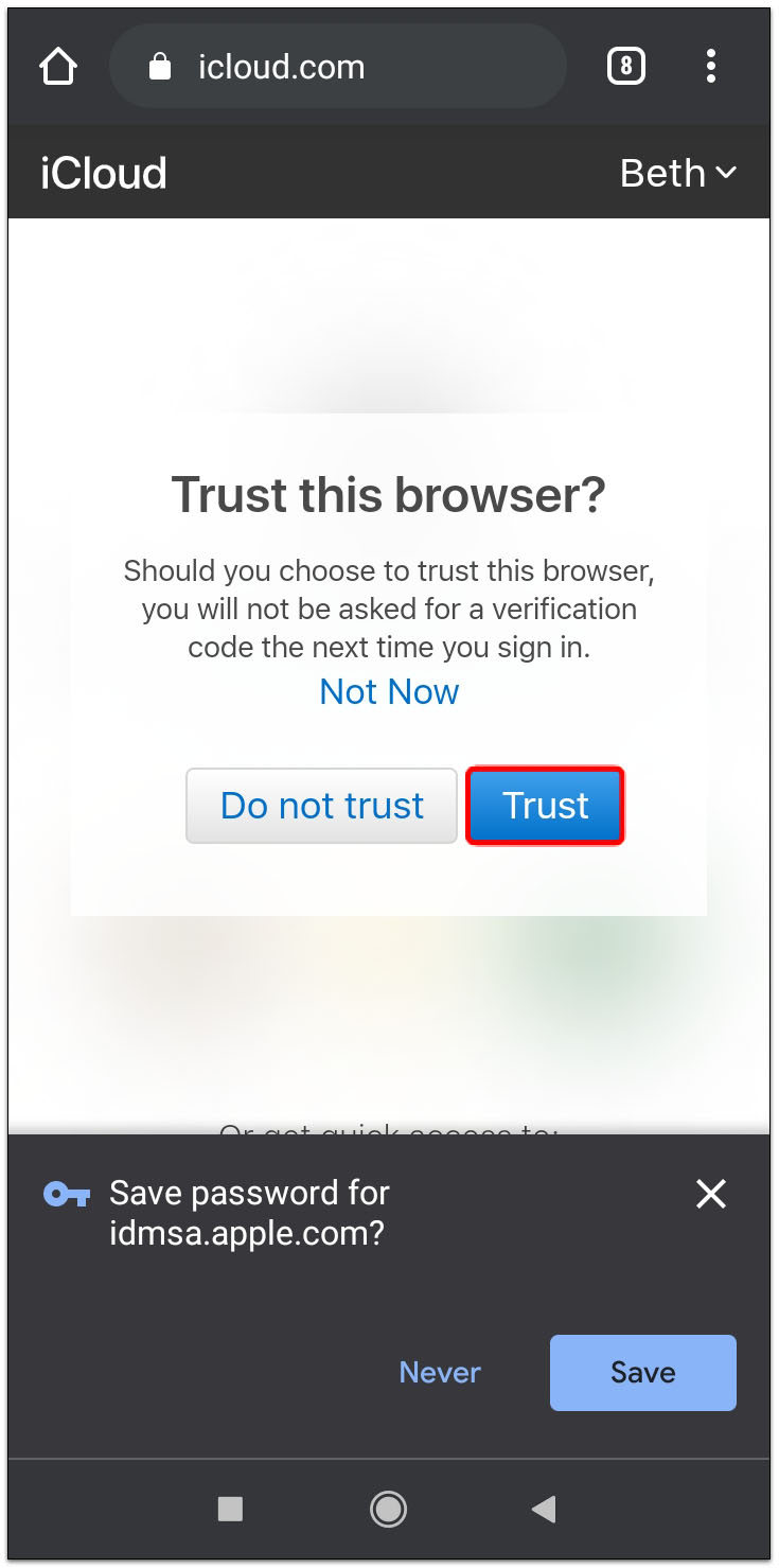 - Confirm that you’re trying to log in using a trusted browser by tapping the blue “Trust” button.