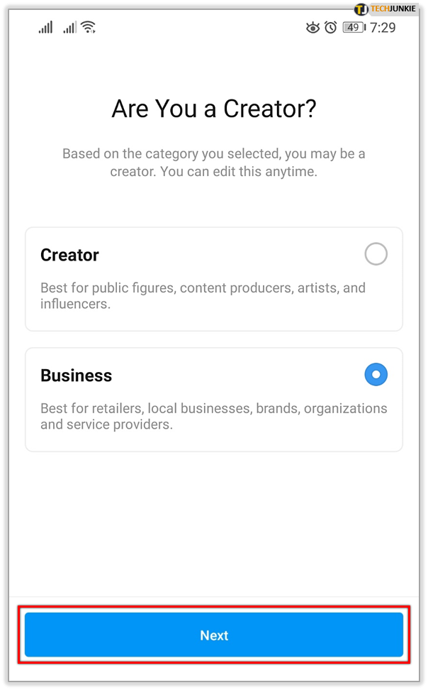 - Follow the on-screen instructions. Select whether you’re a Creator or a Business and tap Next.