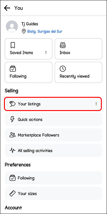 - Look for “Selling” and click on “Your Listings.”